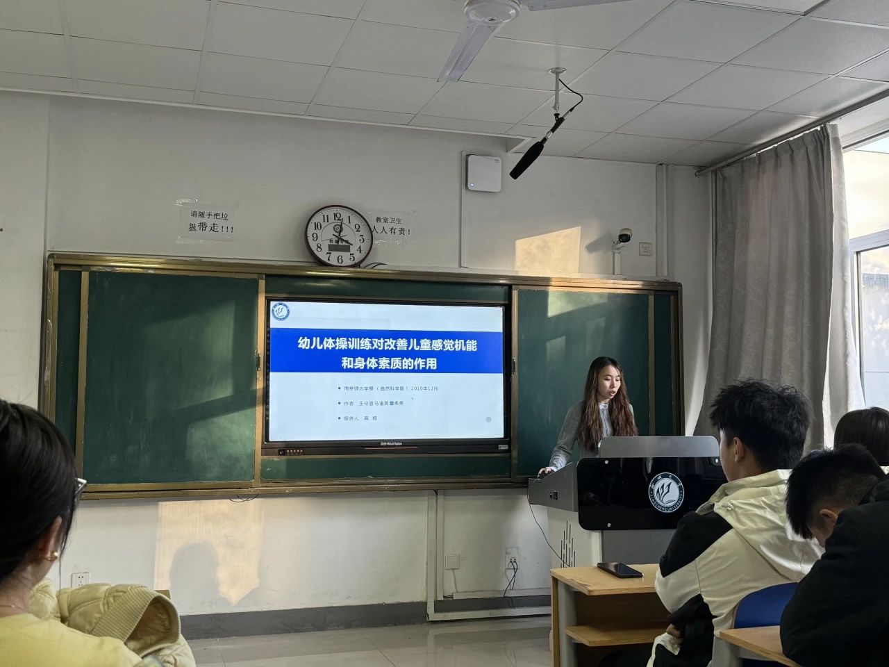 2024级体育教学专业研究生高杨报题目为《幼儿体操训练对改善儿童感觉机能和身体素质的作用》本文基于学生体能下降的背景之下,通过幼儿体操训练对儿童身体素质和感觉机能的作用,了解了幼儿体操训练对儿童力量、柔韧、灵敏、平衡及音乐节奏的影响。