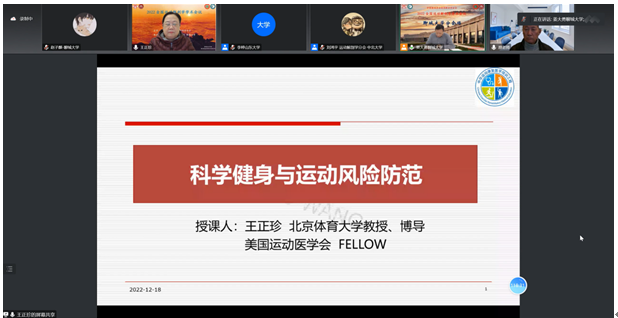 18日晚上,在山东英国正版365首页分会场举办线上学术报告,本次会议由山东英国正版365首页运动与健康学院院长隋波教授、河北医科大学吴文娟教授、陕西师范大学田振军教授、中国医科大学潘诗农教授主持,山东英国正版365首页原校长毛德伟教授、国家体育总局体育科学研究所何子红老师、中国医科大学潘诗农教授、山东大学孙晋浩教授、华南师范大学刘承宜教授分别围绕太极拳促进健康生物力学系列研究、运动天赋与基因标记选材、膝关节运动损伤的影像解剖学分析、运动与多巴胺及活体电化学检测递质释放、患者的准身体模型做了相关汇报。