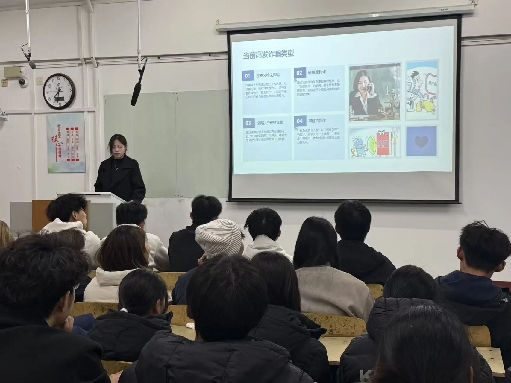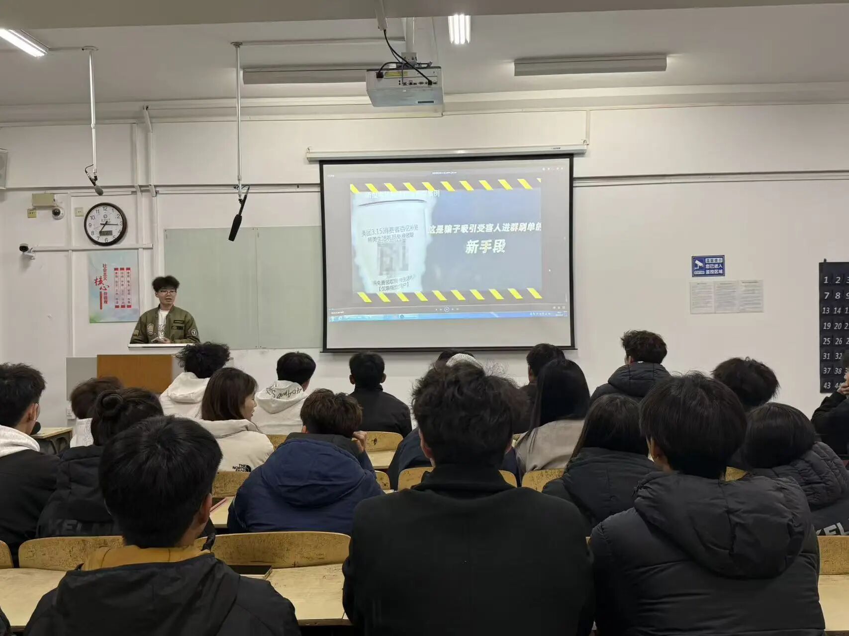 活动伊始,主讲人介绍了本次的核心主题“防范网络电信诈骗”,随后紧扣校园反诈热点,用“身边事”讲“防骗理”,呼吁大家“遇到退款先查官方电话,不点陌生链接、不转陌生账户”;接着聚焦“校园贷”陷阱,提醒同学们“理性消费,远离非法借贷”。随后以“学生易中招的4类骗局”,通过对比真实聊天记录截图、诈骗话术原文,详细剖析“冒充辅导员收教材费”“虚假考研资料售卖”“游戏账号交易诈骗”“兼职刷单返利”的作案流程,特别标注“让先交定金”“要求私下转账”等诈骗关键词。最后讲解“防骗实战指南”,结合案例讲解“三核实”原则——核实对方身份、核实平台资质、核实资金流向,并搭配“遭遇疑似诈骗后,第一时间保存证据、联系保卫处或报警”的步骤示意图,让防骗方法清晰可操作。