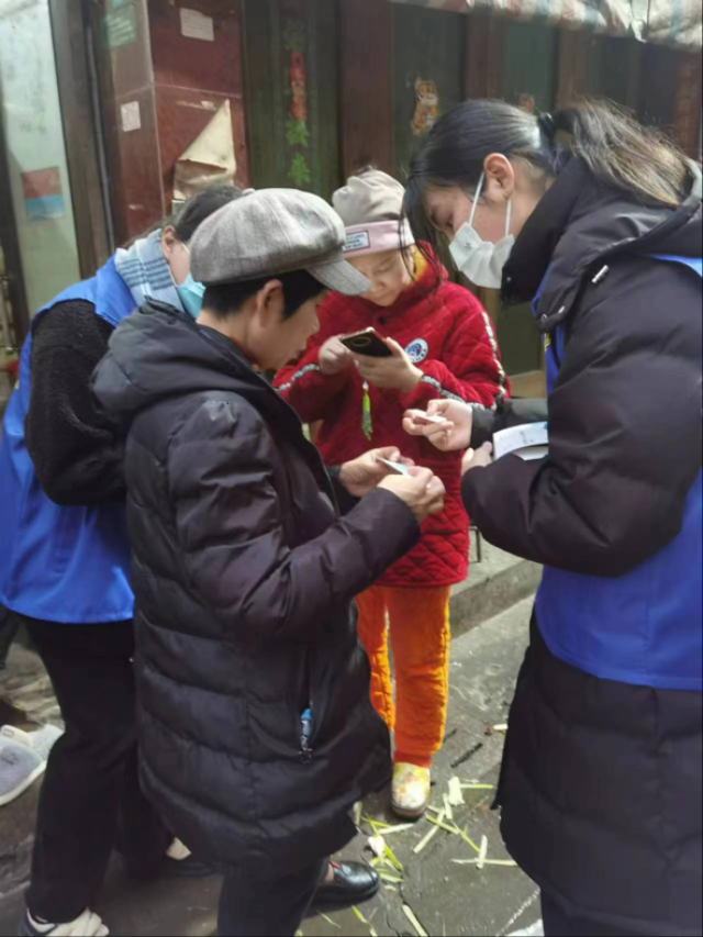 志愿者们准时在社区服务中心门口集合,检查好所需的用品。在志愿代表的带领下,挨家挨户上门询问老人近期健康状况,并向老人发放抗原试剂和为80岁以上的高龄老人测量血氧。志愿者们用通俗易懂的语句向社区老人讲解抗原的用法和一些简单的应对措施,并告诉老人如果遇到不懂的或一些困难可以来社区服务中心询句。面对血氧过低的高龄老人时,志愿者们叮嘱老人的家属尽早带老人去医院检查身体,并时刻关心老人的身体健康,提前做好防范。