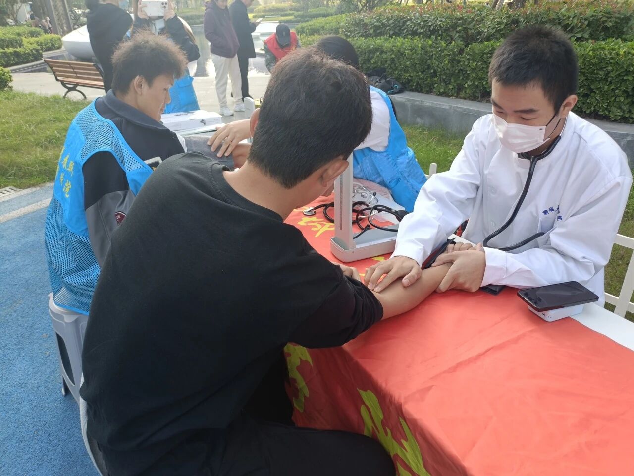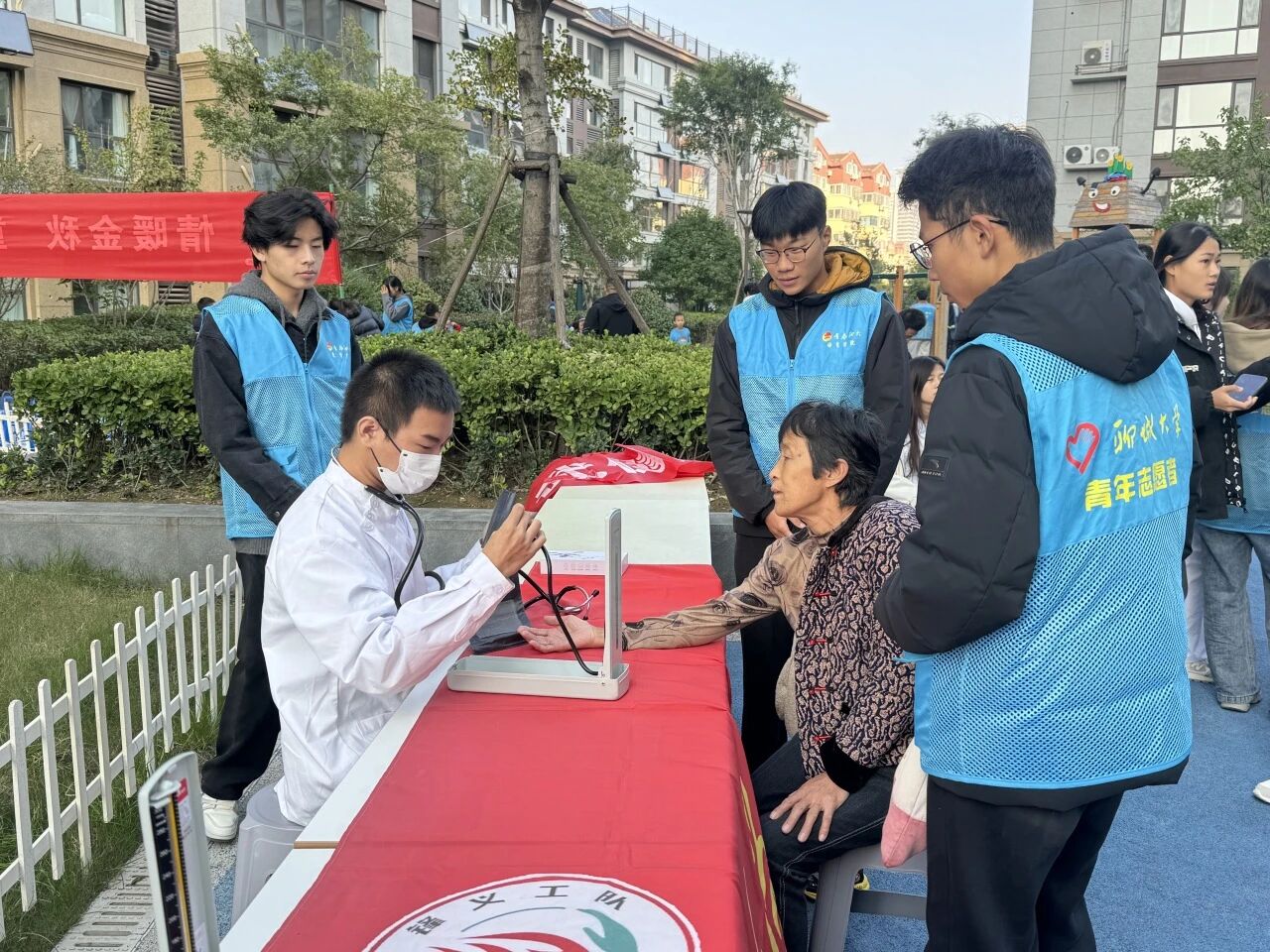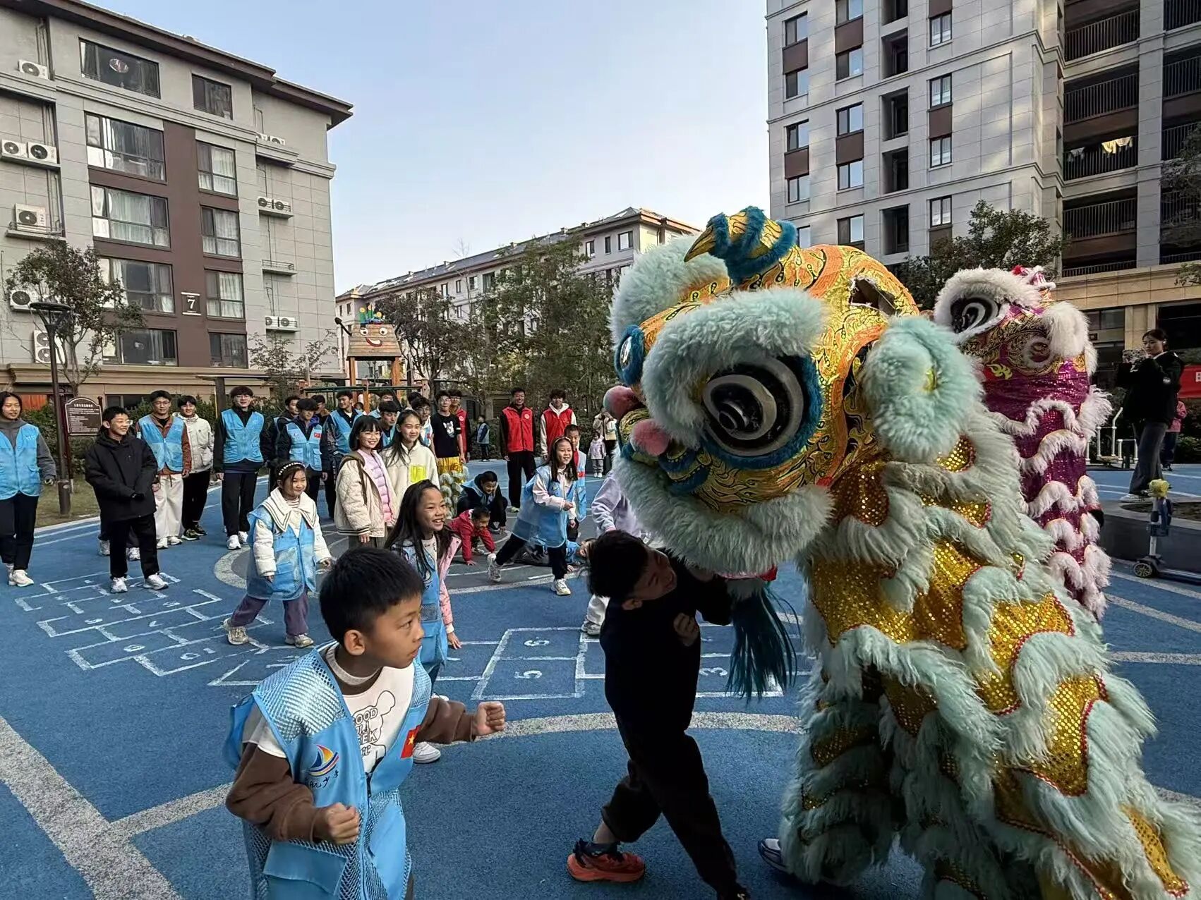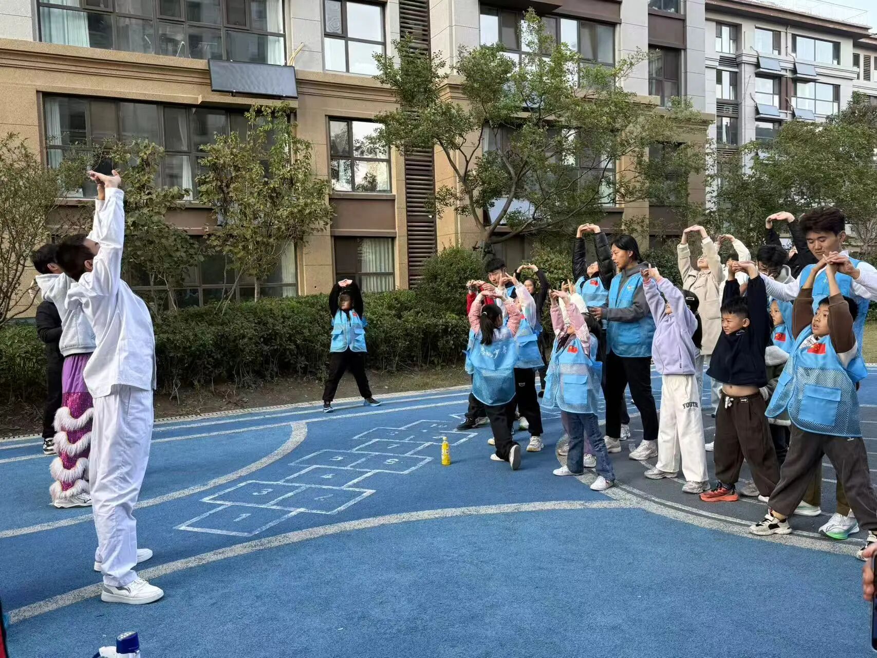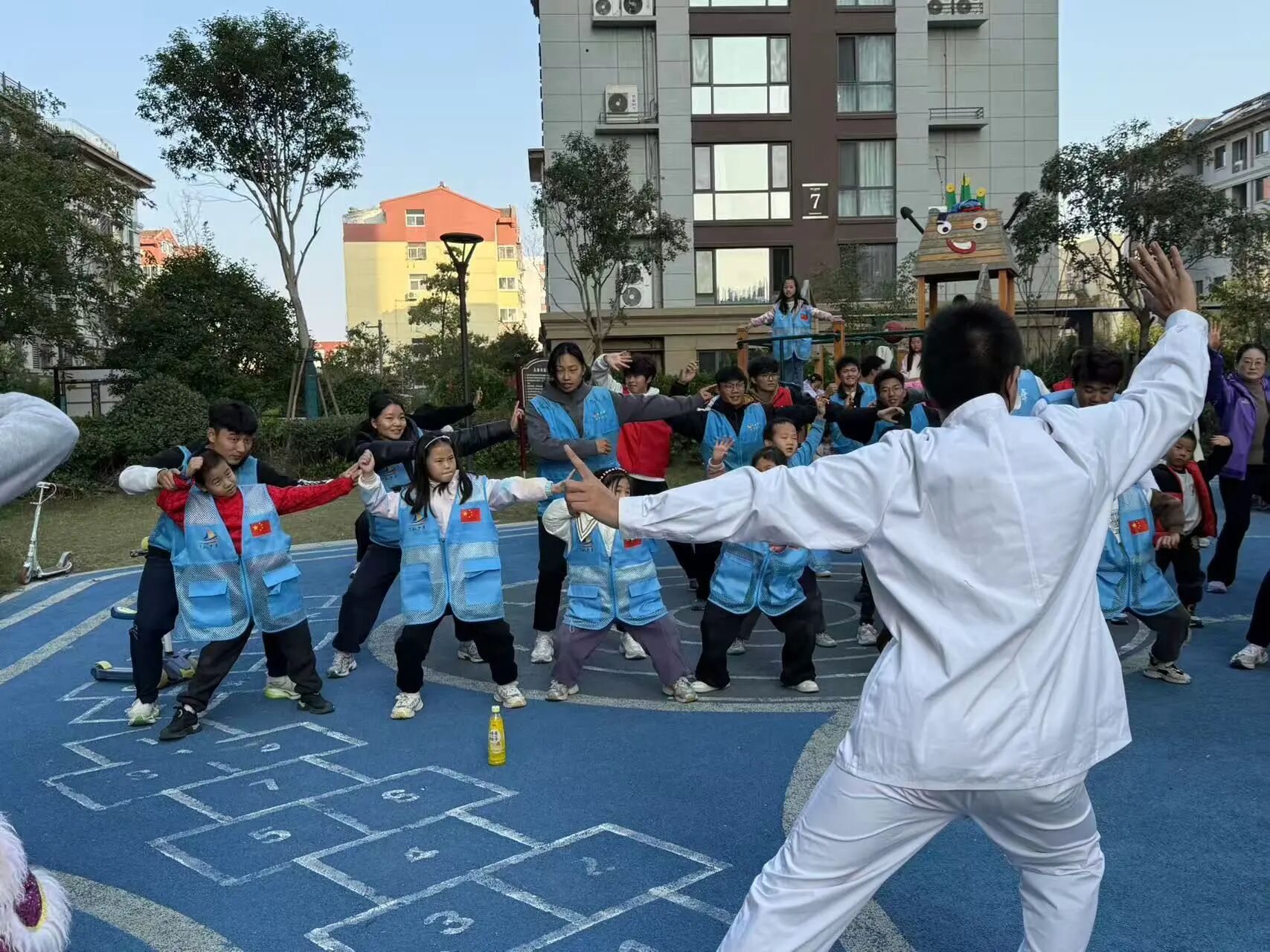 活动伊始,志愿者有序组织观众观看舞狮武术表演,瞬间带动了现场气氛,表演结束后,舞狮成员教小朋友学习简单舞狮动作,将中华传统优秀文化注入人心。之后志愿者带领孩子们围成一圈,开展了说数抱团,反口令,一二三木头人等团体游戏,有效的锻炼了孩子们的反应能力与团队协作能力。此后,医学院的志愿者带领社区群众学习八段锦,讲解了八段锦的作用。活动过程中,志愿者积极与小朋友互动,现场氛围非常活跃,激发了小朋友们对运动和传统文化的兴趣。