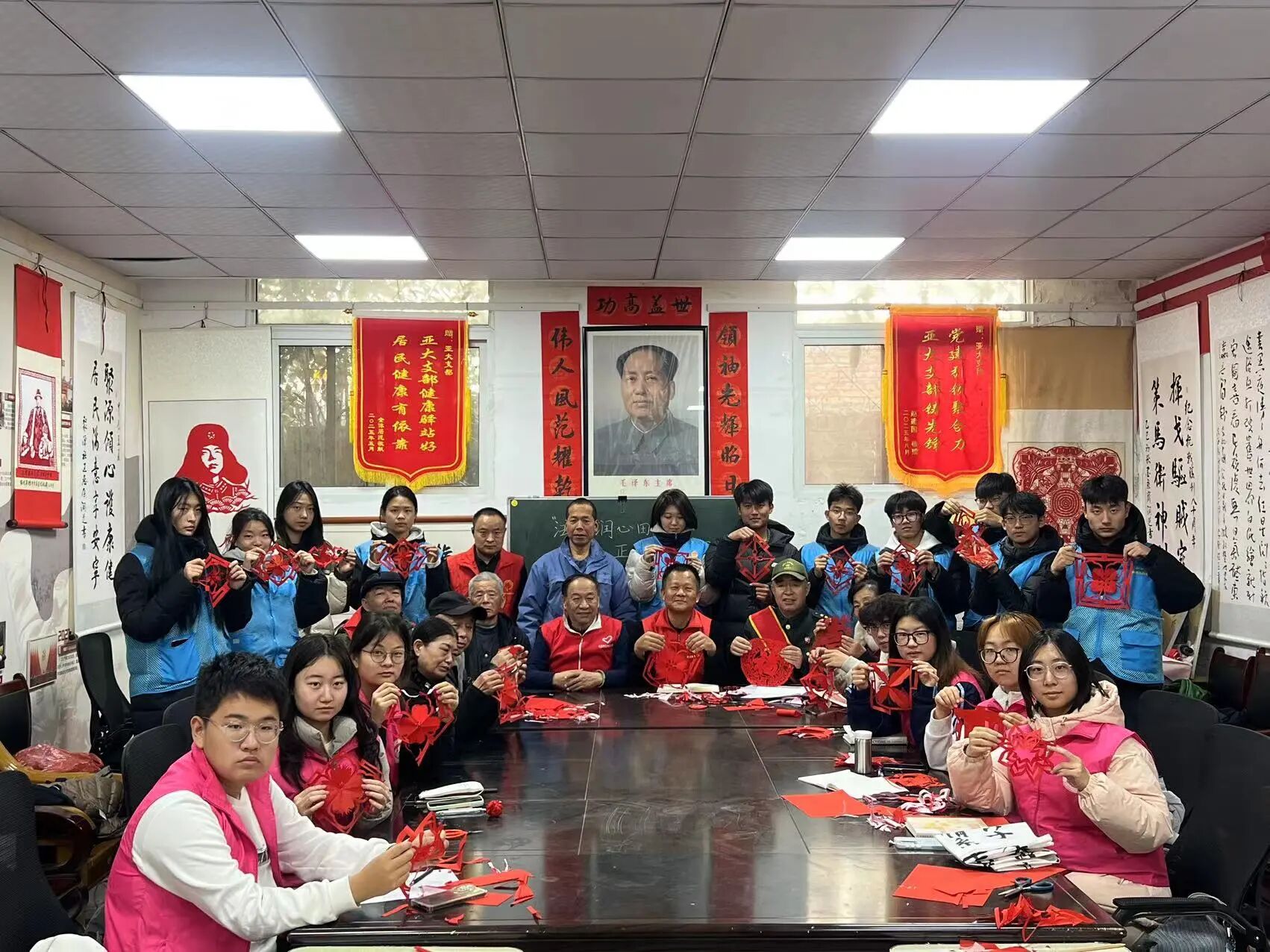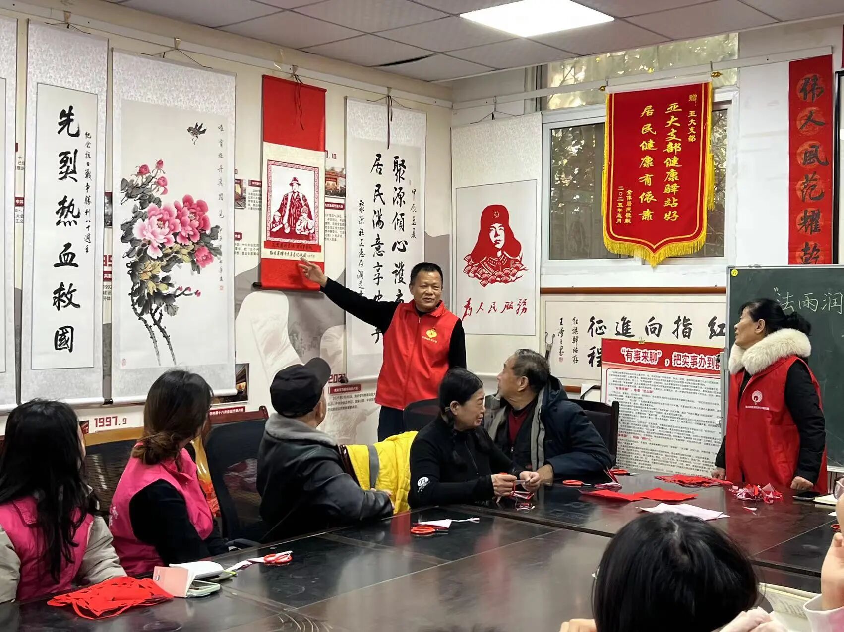 活动开始前,志愿者们与社区充分对接,精心布置场地,统一管理剪纸工具,并准备了应急物资,确保活动安全有序展开。在剪纸环节,社区老师细致讲解剪纸的历史与技法,并生动讲述了董存瑞等英雄事迹,将红色文化融入指尖艺术。志愿者们认真聆听,动手实践,在一折一剪中感悟非遗魅力,也接受了深刻的爱国主义教育。剪纸环节结束后,志愿者与社区太极老师共同带领大家学习太极基础动作,并讲解相关养生知识,帮助大家树立健康生活理念。中医老师为志愿者们把脉问诊,让志愿者了解中医知识,认识中医文化。