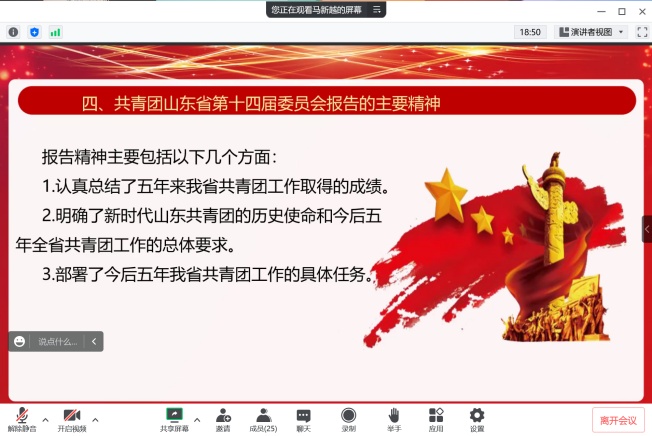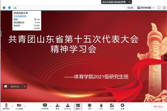 为深入学习贯彻山东省第十五次团代会精神,英国正版365首页于1月3日上午开展了线上学习,各班级、学生组织成员深刻了解和探讨了山东省第十五次团代会精神,以强烈的政治使命感和时不我待的责任感,展现青年作为,扛起时代担当。