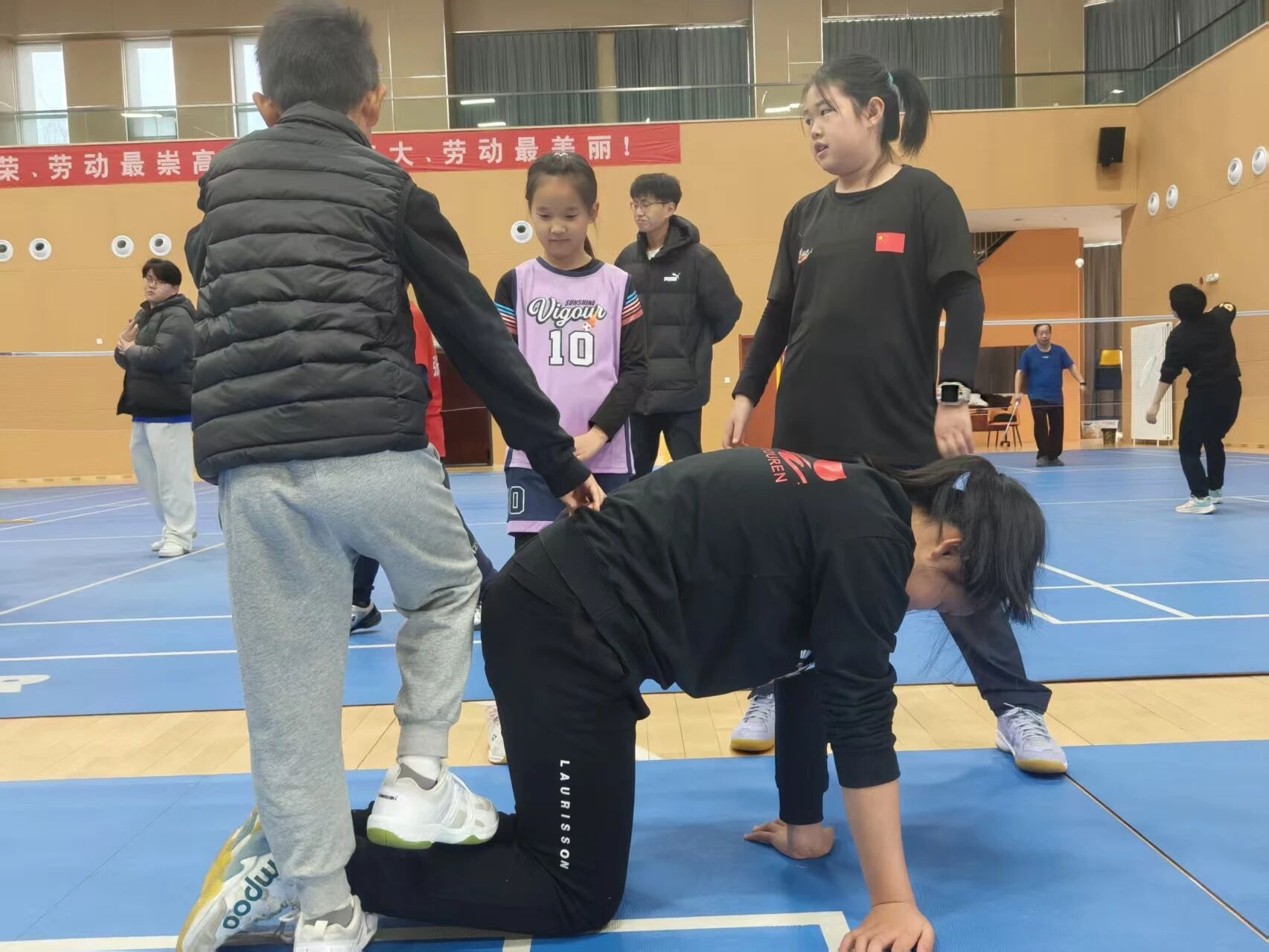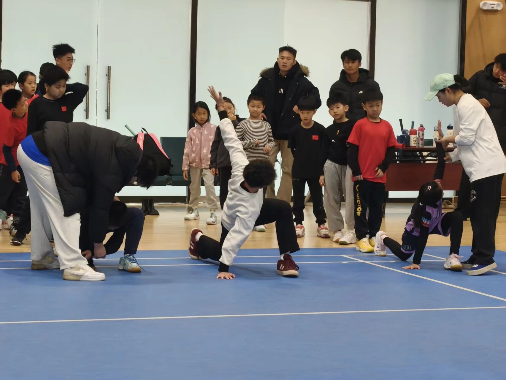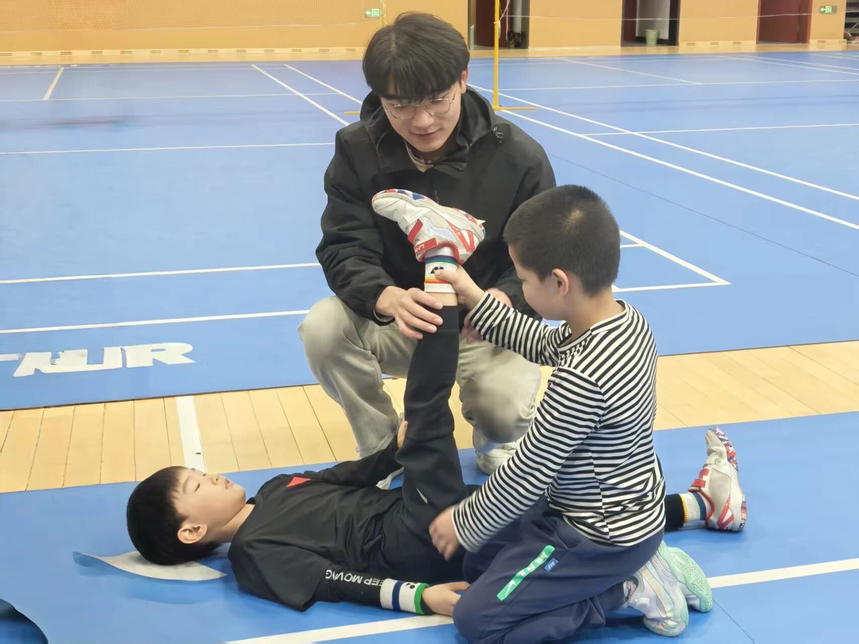 活动伊始,介绍活动主题、目的及核心流程。活动过程中,运动康复专业同学认真细致地讲解科学规范的动态热身方法与具体步骤,带领小运动员们有序开展热身准备;同时科普常见运动损伤的诱发因素,耐心解答运动护具选择、损伤预防及轻微不适处理等疑问。活动尾声,组织实操演示,指导小运动员们相互进行放松练习,重点纠正动作发力模式,确保操作规范。运动康复专业同学以专业实用的知识技能,助力每位热爱运动的参与者有效减少关节损伤,安全享受运动乐趣。
