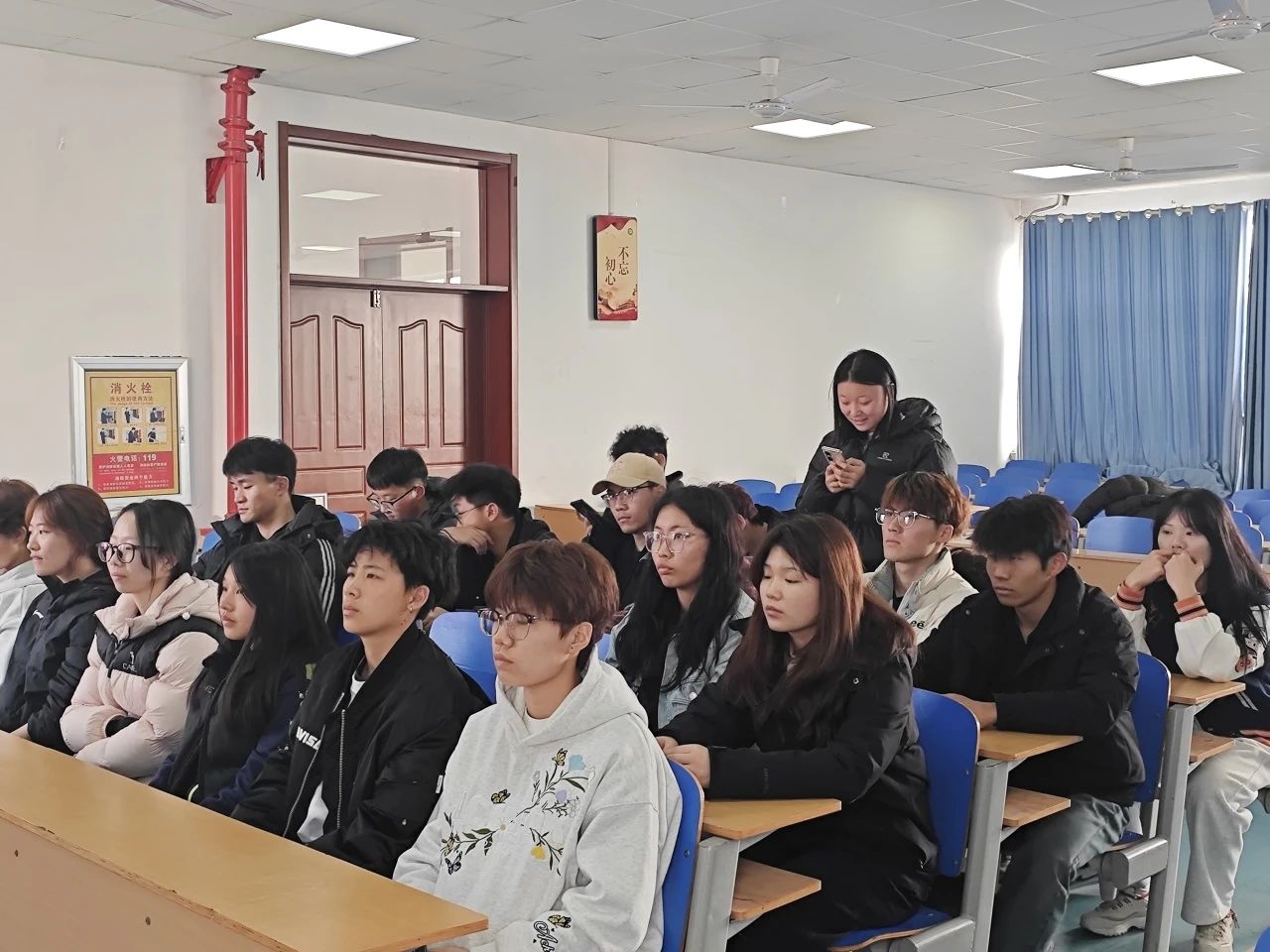 活动伊始,主讲人从个人成长、家庭关系、社会责任等多个角度,分享了感恩对人生的重要影响,呼吁大家珍惜身边的人和事,用行动回馈社会。随后,主讲人让同学们分享身边有关感恩的案例,同学们争先恐后的站起来分享自己身边的感恩故事。李书婷讲述了在训练时自己体能较差,经常掉队,在自己想要放弃时,教练主动陪她加练,在教练的鼓励与陪同下成绩飞速提升。学生就感恩话题展开深入交流,互相分享自己的感恩故事,表达了对父母、老师、教练、朋友以及社会的感激之情。这些真实而温暖的故事,进一步拉近了人与人之间的距离,传递了爱与希望。