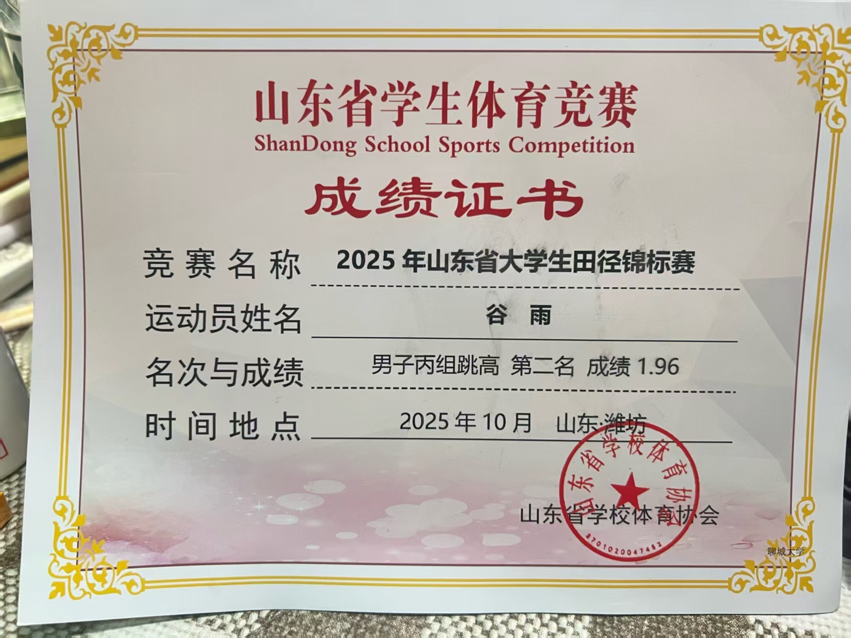 在2025年十月随365(vip)英国上市田径队参加2025年山东省大学生田径锦标赛获得男子丙组跳高第二名