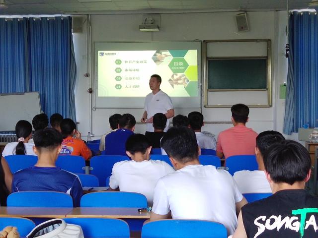 蓝鲸集团的负责人讲到本集团目前以体育培训为主要业务核心,开设有篮球培训羽毛球培训以及青少年体能培训等项目,陆续会在体育赛事、体育场馆、体育科技、体育营地等领域延展,形成以多类目体育培训为中心的相关多元化体育产业集团。此次介绍了招聘岗位所需人员的条件、要求及待遇等作了说明,宣讲过程中,蓝鲸集团的负责人还就就业创业相关政策、简历制作、面试方法等,向同学们面授机宜,多次强调“选择”对于学生们的重要性,希望同学们都能找到目标方向,明确未来的职业发展规划并为之而努力奋斗。